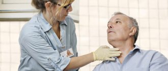 If there is a tumor in the throat, diagnosis begins with collecting anamnesis and listening to the patient’s complaints. Next, the doctor conducts a palpation examination, during which he palpates the cervical lymph nodes and the neck itself. The doctor must use mirrors to examine the oral cavity, tongue, tonsils, and also take a smear from the mucous membrane of the throat. If the tumor is not visualized during the initial examination, but there is an enlargement of the lymph node, then fine needle aspiration is performed, after which the collected biomaterial is sent for histological examination, and the patient is sent for additional diagnostic measures: