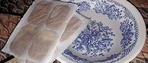 - Dip the mustard plaster into a container of water for 1-3 seconds. If the drug is made in the form of a paper bag, it must be shaken before immersing in water so that the powder is evenly distributed throughout the cells.