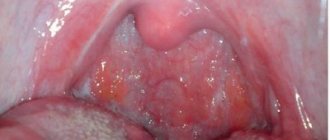 - Гипертрофическая форма: слизистая оболочка горла утолщена, красная и покрыта плотной слизью. На задней стенке глотки имеются либо линзовидные лимфатические узелки, либо утолщенные выпуклые боковые нити.